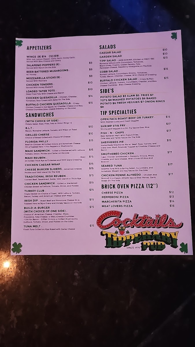 Tipperary Pub Menu